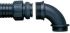 Verschraubung mit 90°-Bogen in schwarz aus Polyamid 6.6 mit feststehendem Außengewinnde für Schutzschlauch mit Nennmaß 13. Diese Flüssigkeitsdichte Verschraubung mit PG9-Gewinde dient zum Einsetzen in Aussparungen mit einer Gegenmutter.