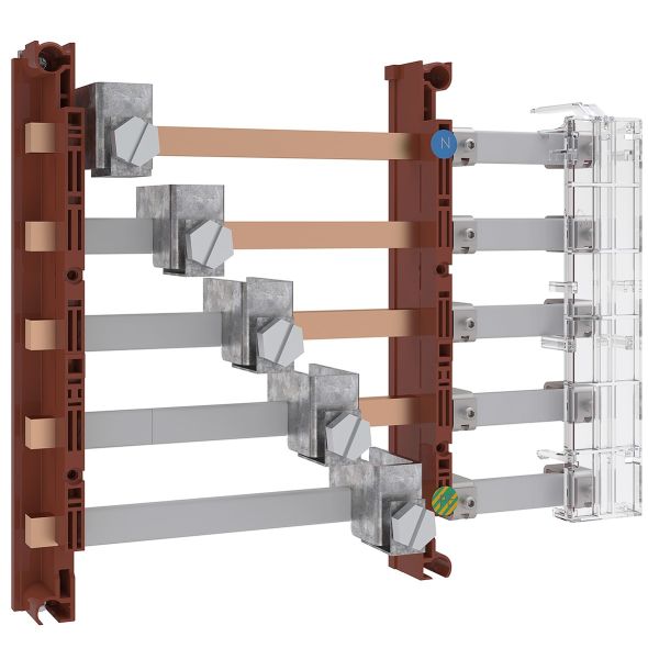 Zubehör bestehend aus: Sammelschienen-Bausatz, 5-polig, für Anschlussgehäuse (GAG12), 355 A, 2 x 12 x 5 mm Cu-Schiene, Schrankverbindersatz zum Anschluss am Zählerschrank, Berührschutzabdeckungen für die Sammelschiene, 5 x Anschlussklemmen 120 mm²
