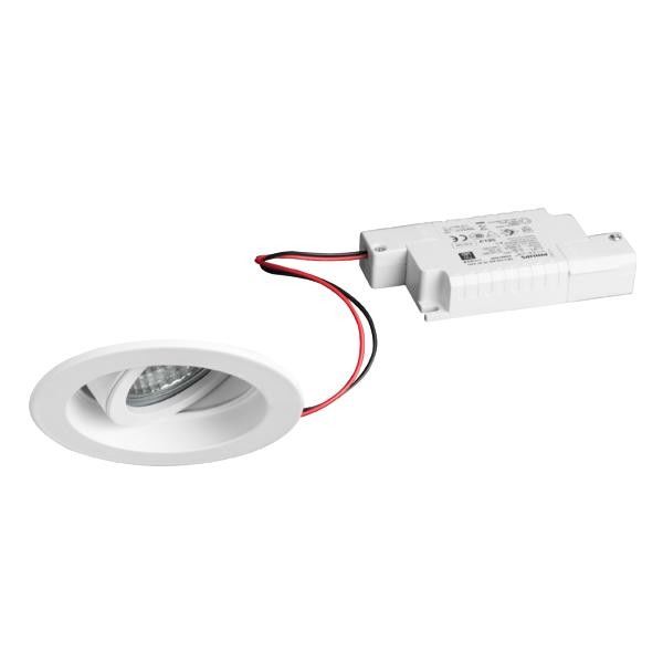 LED-Einbaustrahlerset, Phasenabschnitt dimmbar, weiß matt, rund. Ausgeführt in kompakter Bauform für werkzeuglose Schnellmontage zum Deckeneinbau. Set inkl. Konverter für 230 V-Netzspannung, Phasenabschnitt dimmbar, Maße Konverter: L 110 x B 50 x H 19 mm Ausführung: ohne Fassung,: Einbaumontage, Montageort: Deckenmontage, Material: Aluminium / Glas / Kunststoff, Schutzart raumseitig: nach DIN EN 60529: IP20, Schutzklasse: (EN 61140) II, Spannung: 230V AC 50Hz, Leistung: 6 W, Anzahl der Leuchtmittel / Fassungen: 1 Stück, Lichtstrom: 730 lm, Farbtemperatur: 3.000 K, Abstrahlwinkel: 38°, Verstellbarkeit: schwenkbar, Mit Betriebsgerät: Ja, Dimmbar: Ja, Art der Dimmung: Phasenabschnitt.