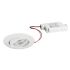 LED-Einbaustrahlerset, Phasenabschnitt dimmbar, weiß glänzend, rund. Ausgeführt in kompakter Bauform für werkzeuglose Schnellmontage zum Deckeneinbau. Set inkl. Konverter für 230 V-Netzspannung, Phasenabschnitt dimmbar, Maße Konverter: L 110 x B 50 x H 19 mm Ausführung: ohne Fassung,: Einbaumontage, Montageort: Deckenmontage, Material: Zinkguss / Aluminiumguss / Aluminium / Glas / Kunststoff, Schutzart raumseitig: nach DIN EN 60529: IP20, Schutzklasse: (EN 61140) II, Spannung: 230V AC 50Hz, Leistung: 6 W, Anzahl der Leuchtmittel / Fassungen: 1 Stück, Lichtstrom: 730 lm, Farbtemperatur: 3.000 K, Abstrahlwinkel: 38°, Verstellbarkeit: schwenkbar, Mit Betriebsgerät: Ja, Dimmbar: Ja, Art der Dimmung: Phasenabschnitt.