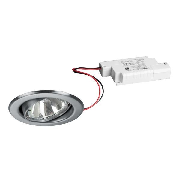 LED-Einbaustrahlerset, Phasenabschnitt dimmbar, chrom matt, rund. Ausgeführt in kompakter Bauform für werkzeuglose Schnellmontage zum Deckeneinbau. Set inkl. Konverter für 230 V-Netzspannung, Phasenabschnitt dimmbar, Maße Konverter: L 110 x B 50 x H 19 mm Ausführung: ohne Fassung,: Einbaumontage, Montageort: Deckenmontage, Material: Stahl / Messing / Aluminium / Glas / Kunststoff, Schutzart raumseitig: nach DIN EN 60529: IP20, Schutzklasse: (EN 61140) II, Spannung: 230V AC 50Hz, Leistung: 6 W, Anzahl der Leuchtmittel / Fassungen: 1 Stück, Lichtstrom: 730 lm, Farbtemperatur: 3.000 K, Abstrahlwinkel: 38°, Verstellbarkeit: schwenkbar, Mit Betriebsgerät: Ja, Dimmbar: Ja, Art der Dimmung: Phasenabschnitt.