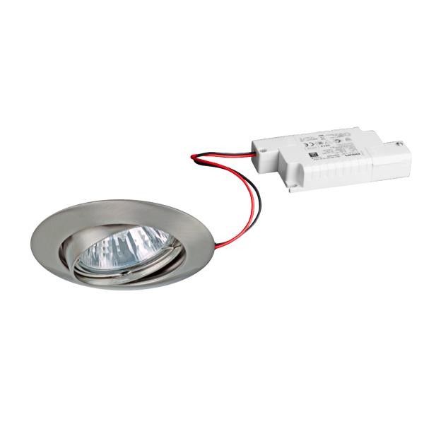LED-Einbaustrahlerset, Phasenabschnitt dimmbar, nickel matt, rund. Ausgeführt in kompakter Bauform für werkzeuglose Schnellmontage zum Deckeneinbau. Set inkl. Konverter für 230 V-Netzspannung, Phasenabschnitt dimmbar, Maße Konverter: L 110 x B 50 x H 19 mm Ausführung: ohne Fassung,: Einbaumontage, Montageort: Deckenmontage, Material: Stahl / Aluminium / Glas / Kunststoff, Schutzart raumseitig: nach DIN EN 60529: IP20, Schutzklasse: (EN 61140) II, Spannung: 230V AC 50Hz, Leistung: 6 W, Anzahl der Leuchtmittel / Fassungen: 1 Stück, Lichtstrom: 680 lm, Farbtemperatur: 3.000 K, Abstrahlwinkel: 38°, Verstellbarkeit: schwenkbar, Mit Betriebsgerät: Ja, Dimmbar: Ja, Art der Dimmung: Phasenabschnitt.