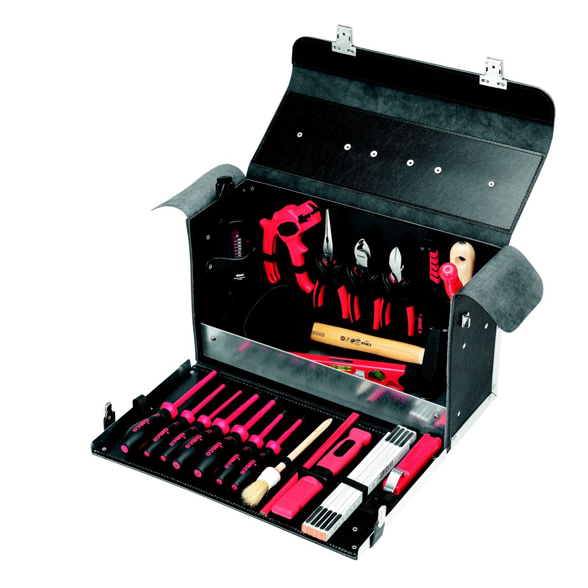 Abisolierzange SUPER 4 PLUS von 0,2 bis 6 mm² (CIMCO-Artikelnr. 10 0780), Innendosen-Stabenentmanteler von einem Ø von 8 bis 13 mm (CIMCO-Artikelnr. 12 2027). Desweiteren sind die folgenden Qualitätswerkzeuge enthalten: Kabelschere DUOCUT (CIMCO-Artikelnr.12 0108), Spannungsprüfer, 2-polig (CIMCO-Artikelnr. 11 1442), 1.000 V Sicherheits-Kabelmesser (CIMCO-Artikelnr. 12 1042), Taschensäge , Spannweite 150 mm (CIMCO-Artikelnr.12 0502),Schlosserhammer geprüft nach DIN 1041/1193, 300 g(CIMCO-Artikelnr.13 0804), Malerspachtel, Breite 40 mm (CIMCO-Artikelnr.13 1324)Gipsmulde aus Weichgummi, ø 125 mm (CIMCO-Artikelnr. 14 0306)Wasserpinsel (CIMCO-Artikelnr. 14 0310)Holz-Gliedermaßstab, 2 m (CIMCO-Artikelnr. 21 0004), SchaltschrankWasserwaage 230 mm, Torpedoform, Horizontal-, Vertikal- und 45°-Libelle (CIMCO-Artikelnr. 21 1540) Zimmermannsstift, schwarz, 240 mm (CIMCO-Artikelnr.21 2170).
