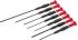Präzisions-Schraubendreher-Sortiment, 7teilig für Schlitzschrauben, Die optimalen Werkzeuge speziell für kleinste Schrauben bei elektronischen und elektrischen Bauteilen, Radio- und Stereoanlagen, Telefonanlagen und allen Kommunikationsanschlüssen, für Feinmechanik, Elektronik, Modellbau und ähnliche fein-sensorische Arbeiten. Klingen aus Spezialstahl, Farbcodierungsring zur Kennzeichnung des Schraubsystems . Für Schlitzschrauben: 2,0x0,4x 60 mm