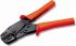 besonders geeignet für ausgedünnte, feindrähtige Leiter nach IEC 228, Länge 230 mm. Hebelübersetzte Presszange mit Ratschenmechanik und Druckpunktentriegelung mit einer Vielzahl auswechselbarer, durch zwei Befestigungsschrauben fixierter Pressprofileinsätze. Die ergonomisch geformte Crimpzange ist leicht und handlich zu bedienen. Über die Hebelwirkung des Griffs wird die integrierte Ratschenautomatik ausgelöst. Regulierbare Zwangsentriegelung gewährleistet optimale Crimpergebnisse. Alle Einsätze werden aus Carbon-Werkzeugstahl angefertigt. Die 17 verschiedenen Profile eignen sich für nahezu alle Verpressungen von Kabelverbindern.