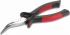 1.000 V Telefonzange mit gebogenen Backen nach DIN ISO 5745, eingelegtes Gelenk, Backen 45° gewinkelt, mit induktiv gehärteter Präzisionsschneide (ca. 60 HRC), lange, flach-runde Backen (Flachrundzange), gezahnte Greifflächen und gezahnte Aussparung (Brennerloch), mit Schneiden für harten und weichen Draht, 160 mm