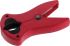 Wellrohrschneider zum Trennen und Ablängen von gewellten Kunststoffrohren (Flexrohren) und Kunststoff-Schutzrohren bis 42 mm ø im Elektro-, Sanitär- und Heizungsbereich, durch einfache Drehbewegung sicheres Schneiden auf dem Außendurchmesser ohne Beschädigung des inneren Rohres, mit zwei auswechselbaren Schneideinsätzen, Gewicht nur 45g. Arbeitsbereich bis zu 42 mm ø