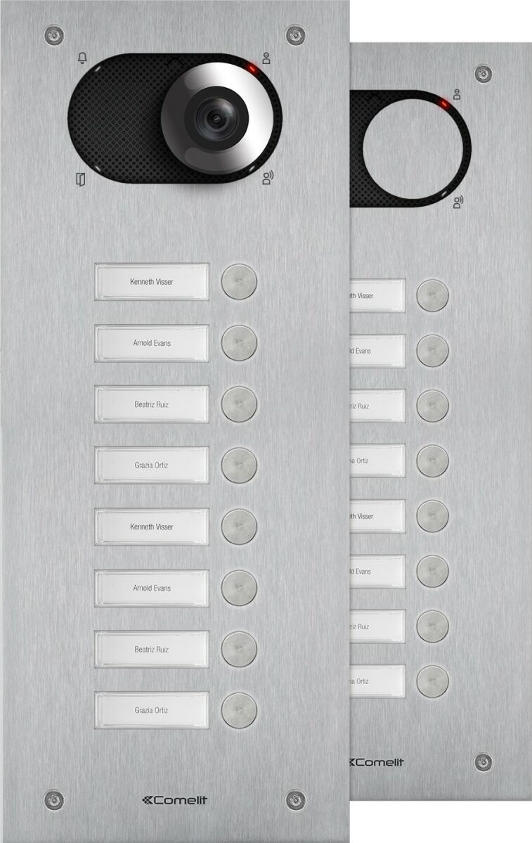 Frontplatte Serie Switch, 8 Teilnehmer, 1-reihig, SB2, VIP. Zu vervollständigen mit dem UP-Gehäuse IX9151 oder AP-Gehäuse IX9161 sowie mit dem Lautsprecher Audio oder Video (Systemabhängig) Art. 1621, 1621VC, 1682, 4680C, 4681 oder 4682HD. Frontplatte aus 2,5mm starker Edelstahlplatte V4A und acht flächenbündig integrierten Klingeltasten. Namensschilder von vorne zu wechseln, inkl. rückseitiger LED-Beleuchtung. Integriertes Ausstattungsmerkmal ist die Handicap-Funktion nach DIN 18040 mit Zustandsanzeige Türruf, Gesprächsbereit, Türöffnerfunktion und Teilnehmererreichbarkeit visuell mit LED s hinter genormten Handicap Symbolen sowie akustischer Sprachausgabe der Zustände. Zu verwenden mit Netzgerät Art. 1210. Schlagfestigkeit: IK08. Abmessungen: 369,1x150x2,5mm.