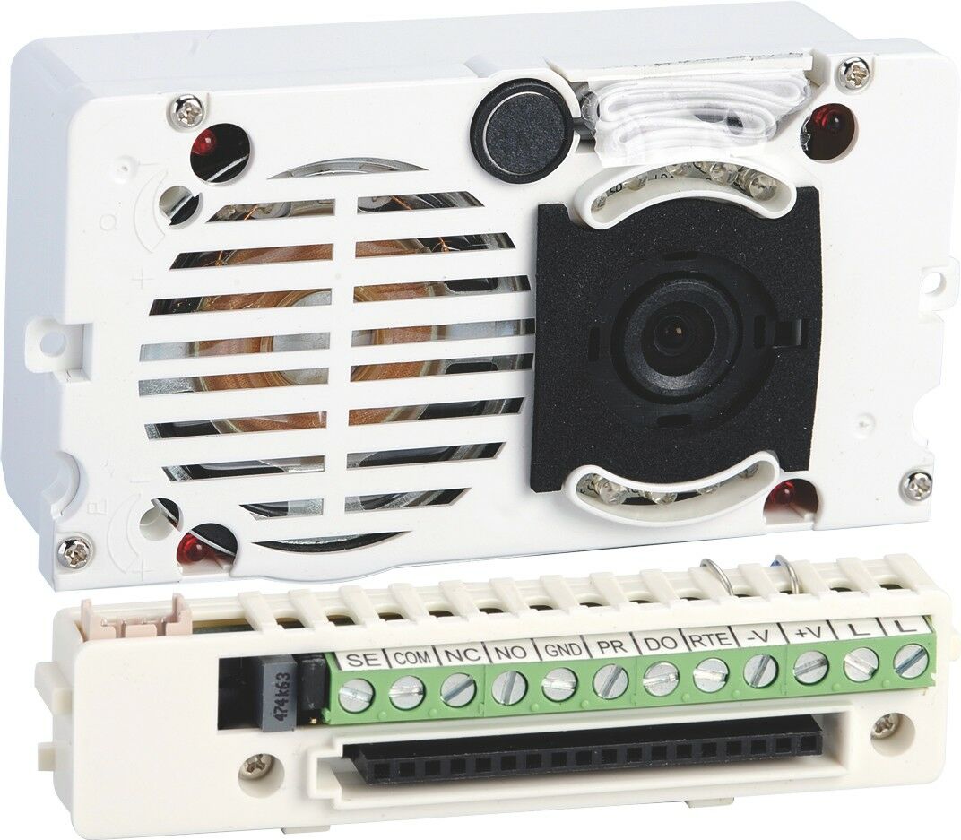 Lautsprechereinheit Audio-Video für System SB mit Klemmenleiste, 1/4'' CCD-Farbvideokamera sowie LED-Beleuchtung für die Videokamera. Integriertes Ausstattungsmerkmal sind die Anschlussmöglichkeit an das Modul für Hörgeräteträger 3332, 3332M, IX9104, IX9204, IX9304, IX9494, IX9504 sowie die Handicap-Funktion nach DIN 18040 mit Zustandsanzeige Türruf, Gesprächsbereit, Türöffnerfunktion und Teilnehmererreichbarkeit visuell mit LED s hinter genormten Handicap Symbolen sowie akustischer Sprachausgabe der Zustände. Sprechverbindung mit Echounterdrückung, staub- und wasserdichtem Lautsprecher, Elektret-Mikrofon und an der Frontseite einstellbarer Lautstärke des Lautsprechers. Mikroprozessor und 8 DIP-Schaltereinheit für die Adressierung der Teilnehmeradressen. Integrierte elektronische Türöffnerfunktion (3A) und zusätzliche Relaiskontakte C, NC, NO mit 10A. 33V DC-Versorgung über das entsprechende Netzgerät Art. 1210. Für den Einbau in die Module Art. 1250iKV, 1250U, 33410(M), 33411(M) und 33412(M). Abmessungen: 102x55x38mm.