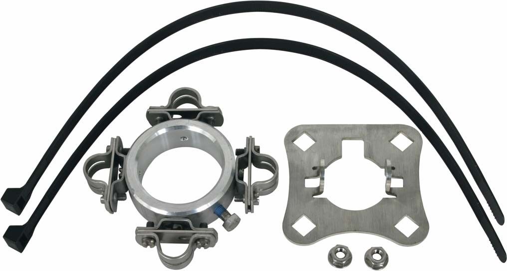 Befestigungsset zur Montage der HVI long Leitung an HVI long Stützrohren, bestehend aus Anschlussplatte (vierfach, inkl. zwei Sperrzahnmuttern) und Befestigungsring mit vier geschlitzten Leitungshaltern (D 20 mm) für den Endverschluss (inkl. zwei Kabelbinder).