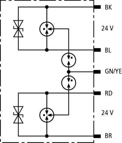 Überspannungsableiter in druckfester Kapselung zum Einsatz in explosionsgefährdeten Bereichen zum Schutz von zwei 24 V-Schnittstellen.