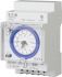 Reiheneinbau-Schaltuhr ca. 200 Stunden Gangreserve, Breite 52,5 mm, 7-Tage-Programm., kürzeste Schaltzeit 2 Std., Uhrzeiger für Zeitanzeige und 12h/24h Erkennung, Uhrzeitkorrektur im und gegen den Uhrzeigersinn möglich, Schaltungsvorwahl, Handschalter mit 3 Stellungen: Dauer-EIN/AUTO/Dauer-AUS, Schaltzustandsanzeige, DuoFix Federsteckklemmen für jeweils 2 Leiter, 1 Wechsler, 16 A/250 V~, 230V /45-50 Hz, Klarsichtabdeckung plombierbar.
