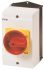 Hauptschalter/Lasttrennschalter Ein-Aus nach IEC/EN 60947-3, 690V/63A, Schutzart Front IP65, Griff rot mit Sperrkranz gelb abschliessbar mit 3 Vorhängeschlössern, Trennschalter P3 haben eine sehr kompakte und robuste Bauweise. Der Handantrieb wirkt direkt auf die Verbindung der Kontakte. Die Kontakte werden beim Ausschalten zum Öffnen gezwungen. Ausführung allgemein: Isoliermaterial, Gehäuse zur Oberflächenmontage, Einbau, Zwischenbau, IVS Verteilereinbau