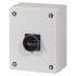EIN-AUS-Schalter, Typkenner: T3, Funktionen: STOPP-Funktion, Ausstattung: Schwarzer Drehgriff und Sperrkragen, 3-polig, abschließbar in der Stellung 0 (Aus), Schutzart: IP65, Aufputzmontage