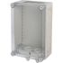 Basisgehäuse Stromverteiler mit montierten Kabelstutzen, Material: Polycarbonat, schlagfest, Schutzart IP65, patentierter Deckelverschluss mit integriertem Überdruckausgleich, Gehäuseseitenwände geschlossen, ausschlagbar, Wände oben oder unten offen, Leitungen von vorne einlegbar durch geteilte Kabelschellen, plombierbare Deckelverschlüsse, RAL 7035, Grau (Sockel), transparent rauchgrau, (Abdeckung), Einbautiefe bei Montageplatte=150mm, Abdeckungstyp: transparent rauchgrau, Ausführung Unterteil: oben offen unten Kabelstutzen