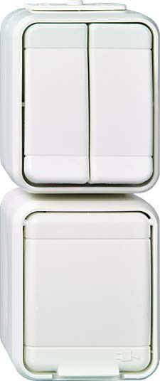 Serienschalter und Steckdose senkrecht. Farbe: licht-/basaltgrau, Kombinationen Schalter 10 A 250V AC/ Schutzkontakt-Steckdose 16 A 250V AC, für Aufputzmontage. Schutzart IP 44, mit zwei Leitungseinführungen, Steckklemmen: Klemmbereich für Kupferleiter 1,5 mm und 2,5 mm, Verbindungsklemmen nach VDE 0620.