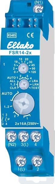 Stromstoß-Schaltrelais mit 2 Kanälen, 1+1 Schließer potenzialfrei 16A/250V AC, 230V-LED-Lampen bis 400W, Glühlampen 2000W, mit DX-Technologie. Bidirektional. Stand-by-Verlust nur 0,1 Watt. Reiheneinbaugerät für Montage auf Tragschiene DIN-EN 60715 TH35. 1 Teilungseinheit = 18mm breit, 58mm tief. Anschluss an den ELTAKO-RS485-Bus. Querverdrahtung Bus und Stromversorgung mit Steckbrücke. Mit der patentierten ELTAKO-Duplex-Technologie können die normalerweise potenzialfreien Kontakte beim Schalten von 230V-Wechselspannung 50Hz trotzdem im Nulldurchgang schalten und damit den Verschleiß drastisch reduzieren. Hierzu einfach den N-Leiter an die Klemme (N1) und L an 1(L) und/oder N an (N2) und L an 3(L) anschließen. Dadurch ergibt sich ein zusätzlicher Stand-by-Verlust von nur 0,1 Watt. Beim Ausfall der Versorgungsspannung bleibt der Schaltzustand erhalten. Bei wiederkehrender Versorgungsspannung wird definiert ausgeschaltet. Die Kanäle können unabhängig voneinander als ES- und/oder ER-Kanal eingelernt werden. Szenen-Steuerung: Mit einem der vier Steuersignale eines als Szenentaster eingelernten Tasters mit Doppelwippe können mehrere Kanäle eines oder mehrerer FSR14-2x zu je einer Szene ein- bzw. ausgeschaltet werden. Zentralbefehle können mit Funktastern und/oder mit einem Controller gesendet werden. Mit den Drehschaltern werden die Taster eingelernt und gegebenenfalls die 2 Kanäle getestet. Für den Normalbetrieb werden der mittlere und der untere Drehschalter anschließend auf AUTO gestellt. Bei dem oberen Drehschalter wird ggf. für alle Kanäle gleich die EW-Zeit (0-120 Sekunden) für Relais bzw. die RV-Zeit (0-120 Minuten) für Stromstoßschalter eingestellt. Werden Funk-Bewegungs-Helligkeitssensoren FBH (Master) und/oder FBH (Slave) eingelernt, wird mit dem oberen Drehschalter, für jeden Kanal getrennt, die Schaltschwelle festgelegt, bei welcher die Beleuchtung einschaltet bzw. ausschaltet. Einstellungen des oberen Drehschalters gemäß Bedienungsanleitung. Werden Funk-Helligkeitssensoren eingelernt, wird mit dem oberen Drehschalter, für jeden Kanal getrennt, die Schaltschwelle festgelegt, bei welcher in Abhängigkeit von der Helligkeit die Beleuchtung einschaltet bzw. ausschaltet (von ca. 0 lux in der Position 0 bis ca. 50 lux in der Position 120). Eine Hysterese von ca. 300 lux zwischen dem Ein- und Ausschalten ist fest eingestellt. Eine zusätzlich eingestellte RV-Zeit wird nicht beachtet. Je Kanal kann nur ein FBH (Master) oder FAH eingelernt werden. Ein FBH (Master) oder FAH kann jedoch in mehrere Kanäle eingelernt werden. Werden Funk-Fenster-Türkontakte FTK oder Fenstergriffsensor FFG7B eingelernt, lassen sich mit dem mittleren Drehschalter in den Positionen AUTO 1 bis AUTO 4 unterschiedliche Funktionen einstellen und maximal 116 FTK verknüpfen: AUTO 1 = Fenster zu, dann Ausgang aktiv. AUTO 2 = Fenster offen, dann Ausgang aktiv. In den Stellungen AUTO 3 und AUTO 4 sind die auf einem Kanal eingelernten FTK automatisch verknüpft. Bei AUTO 3 müssen alle FTK geschlossen sein, damit der Arbeitskontakt schließt (z.B. für Klimasteuerung). Bei AUTO 4 genügt ein geöffneter FTK, um den Arbeitskontakt zu schließen (z.B. für Alarmmeldung oder Zuschalten der Stromversorgung eines Dunstabzuges). Ein oder mehrere FTK können in mehrere Kanäle eingelernt werden, damit verschiedene Funktionen gleichzeitig je FTK möglich sind. Nach einem Stromausfall wird die Verknüpfung durch ein neues Signal der FTK bzw. bei der nächsten Statusmeldung nach 15 Minuten wieder hergestellt. Eine zusätzlich eingestellte RV-Zeit wird nicht beachtet. Funktion mit Funk-Rauchwarnmeldern FRW oder Wassersensoren gemäß Bedienungsanleitung. Die LED unter dem oberen Drehschalter begleitet den Einlernvorgang gemäß Bedienungsanleitung und zeigt im Betrieb Steuerbefehle durch kurzes Aufblinken an.