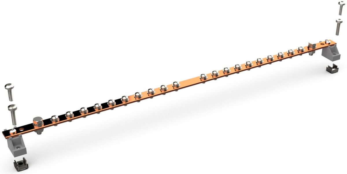Erdungsschiene aus Kupfer, 2 Haupterdungsanschlußpunkte mit M6 Schrauben, 20 Befestigungspunkte mit M5 Schrauben, 2 Isolatoren, Montage als 19Zoll Lösung möglich, Montage als 10HE vertikal Lösung am Eckprofil oder seitlich am 19Zoll Profil möglich, inklusive Befestigungsmaterial
