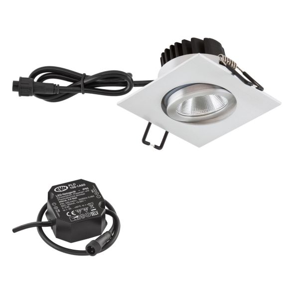 Mit der COB-LED Deckeneinbauleuchte lassen sich vielfältige Anwendungen im Innenbereich, wie z. B. Effektbeleuchtung, Raumbeleuchtung, Akzentuierte Beleuchtung und vieles mehr realisieren. Beim Einbau in geschlossene Decken erreicht die Leuchte die Schutzart IP65. Aufgrund dessen kann die Leuchte natürlich ebenso für Feuchtraum-Anwendungen und im Außenbereich eingesetzt werden. Zusätzliche Kosten für Leuchtmittel entfallen bei dieser Leuchte, da die Leistung von einem fest verbauten LED-Chip geliefert wird. Da im Lieferumfang das Netzgerät bereits enthalten ist, fallen auch hierfür keine zusätzlichen Kosten an. Der Schwenkwinkel beträgt 20°. tc: 75°C.