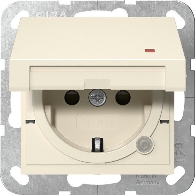 Schutzkontaktsteckdose (Typ F) 16 A 250 V~ mit Klappdeckel, Kontrolllicht und erhöhtem Berührungsschutz (Safety Plus) Cremeweiß glänzend System 55 - Geerdeter Tragring. Mit erhöhtem Anpressdruck des Erdungsbügels geprüft nach T.N.O. Erhöhter Berührungsschutz (Safety Plus) gemäß DIN VDE 0620-1. LED-Beleuchtungselement ist im Lieferumfang enthalten.