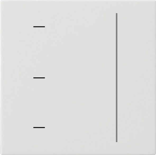 System 3000 Touchaufsatz Reinweiß seidenmatt - Die Steuerung erfolgt durch leichtes Berühren oder Wischen auf der Bedienfläche. - Drei Helligkeitswerte speicherbar, mit System 3000 Dimmeinsatz. - Laufzeit und eine individuelle Zwischenposition speicherbar mit System 3000 Jalousiesteuereinsatz. - Sperrfunktion, mit System 3000 Jalousiesteuereinsatz. - Statusanzeige durch LED-Leuchtbalken zur Darstellung der Helligkeit oder Behangposition. - Permanente oder zeitweise Statusanzeige (Statusanzeige erlischt nach 5 Sekunden ohne Berührung). - Betrieb auf System 3000 Schalt-, Dimm- oder Jalousieeinsatz bzw. Nebenstelleneinsatz 3-Draht.