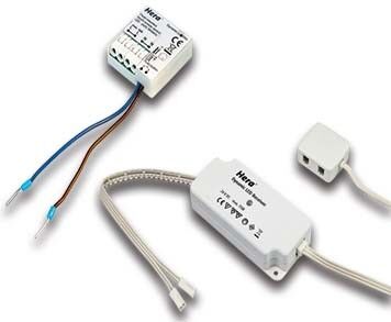 Dynamic-Controller 24V DC mit beiliegendem UP Funk-Tast-Modul, es können bis zu 7 verschiedene Sender auf einem Controller angelernt werden, das UP Funk-Tast-Modul kann jeweils parallel auf beliebig viele Controller angelernt werden, Anschlussleitung mit zwei LED 24-Steckern und 12-fach Verteiler für die Leuchten