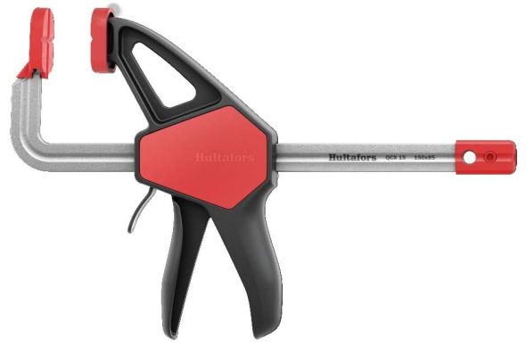 Kompakte Ein-Hand Zwinge aus Glasfaser verstärktem Nylon. Die Stahlschiene wurde aus einem Stück geschmiedet, mit einem schlanken Spannarm, um auch enge Zwischenräume erreichen zu können. Druckplatten mit Gummipads schonen die Oberfläche und erhöhen den Zwingendruck. Für Feinarbeiten entworfen und hergestellt.