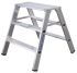 Aluminium Montagebock mit 2 x 2 Stufen, Standhöhe ca. 45 cm, extra breite (61 cm) Ausführung, 80 mm tiefe Stufen für bequemen Stand, rutschsicher profiliert, starre Aussteifung für maximale Trittsicherheit, kräftige Alu Gussgelenke, ebene Fläche als oberer Abschluss, rutschfeste Leiterfüße im Holm verschraubt dadurch leicht auswechselbar, Stufen-Holm Verbindung durchgesteckt und verbördelt, fahrbare Ausführung auf Anfrage, Holmgröße 70 mm, nach DIN EN 14183 / Tritte, ermöglicht TRBS konformes Arbeiten