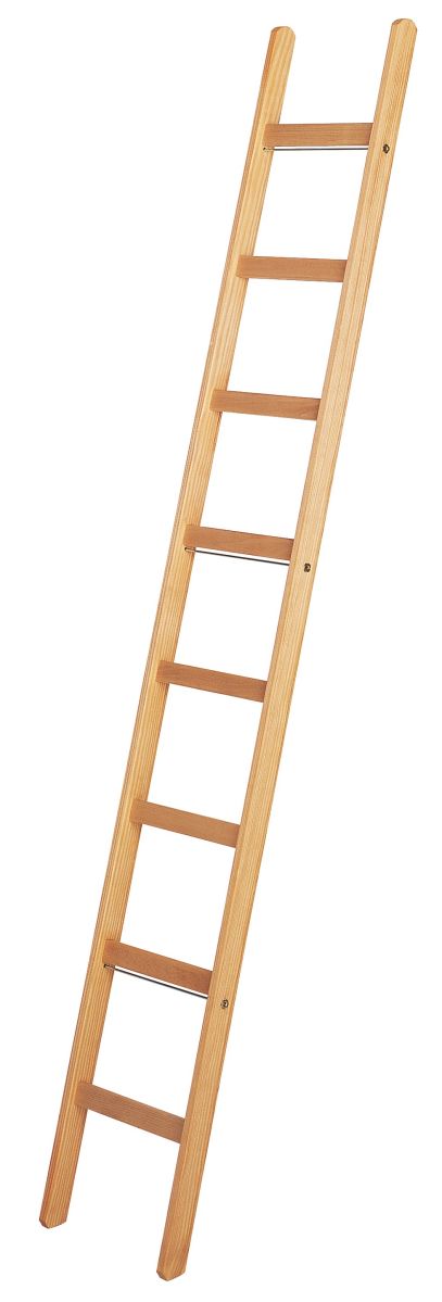 Die klassische Bauleiter aus Holz mit 8 Sprossen, 2,38 m lang, parallel mit Vierkantholmen, nachstellbare Spannbolzen, Breite 38 cm, Holmgröße 66 mm, nach DIN EN 131, TRBS konform als Verkehrsweg