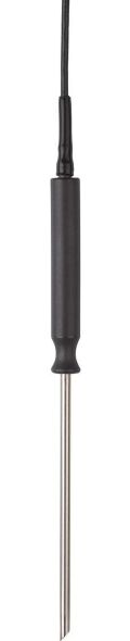 Das einstechbare Widerstandsthermometer mit Anschlussleitung und Handgriff ermöglicht, aufgrund der Temperaturabhängigkeit des elektrischen Widerstandes seines eingebauten Platin-Sensors und des robusten und wasserdampfdichten Aufbaus, eine Temperaturmessung in fast allen Bereichen der Lebensmittelverarbeitung und -konservierung. Das Sondenrohr mit einer Abmessung von 4,0 x 100 mm ist aus Edelstahl 1.4571 gefertigt und besitzt eine angeschrägte Messspitze mit 45° -Winkel. Der in T-Form montierte Handgriff besteht aus PEEK und hält Temperaturen bis +260 °C stand. Das Widerstandsthermometer wird daher bevorzugt für Koch-, Gar- und Backvorgänge eingesetzt. Weitere Einsatzgebiete sind Autoklaven und Sterilisatoren. Das Widerstandsthermometer nach DIN EN 60751 (Klasse B) ist als 1 x Pt100 in Dreileiterschaltung ausgeführt und für Temperaturen von -50 bis +260 °C ausgelegt. Die 4,0 m lange Anschlussleitung aus PTFE ist am Übergang zugentlastet montiert. Die zulässige Umgebungstemperatur der Anschlussleitung beträgt -50 bis +260 °C. Das offene Anschlussende ist mit Aderendhülsen nach DIN 46228 Teil 4 bestückt. Die Ausführung ist zudem hocherschütterungsfest aufgebaut und der verwendete Griff ist öl- und säurebeständig.