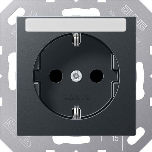 Schutzkontakt®-Steckdose, anthrazit matt mit Schriftfeld 6 x 46 mm mit Federklemmen für starre und unbehandelte flexible Leiter bis 2,5 mm2 Verbindungsklemmen nach DIN VDE 0620 Tragring, Krallen und Krallenschrauben sind über eine Erdungsschiene in die Schutzmaßnahme eingebunden. Ersatzteil: Transparente Abdeckung mit Einlage Art.-Nr.: A 20 NA Material: Thermoplast lackiert Maße (B x H): 55 x 55 mm