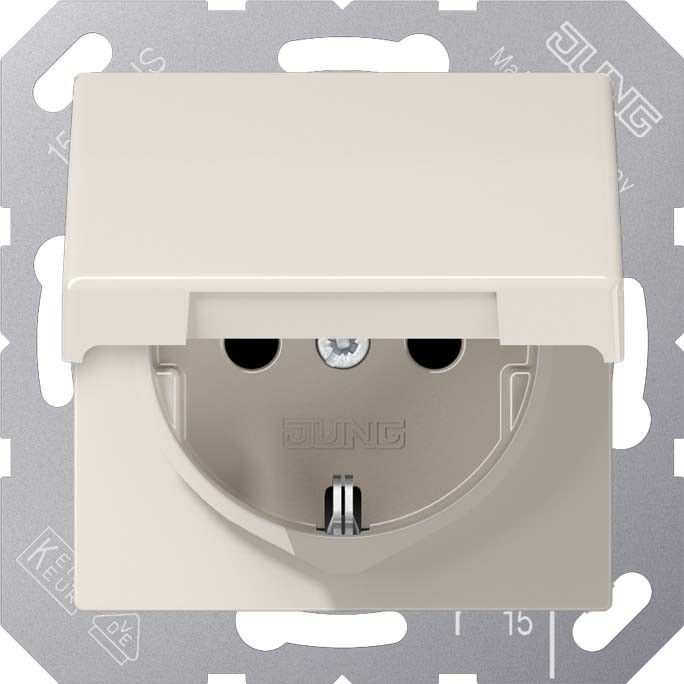 Schutzkontakt®-Steckdose, weiß mit Klappdeckel (mit Rückstellfeder) mit Schraubklemmen für starre und flexible Leiter bis 2,5 mm2 Verbindungsklemmen nach DIN VDE 0620 Tragring, Krallen und Krallenschrauben sind über eine Erdungsschiene in die Schutzmaßnahme eingebunden. Material: Duroplast Maße (B x H): 55 x 55 mm