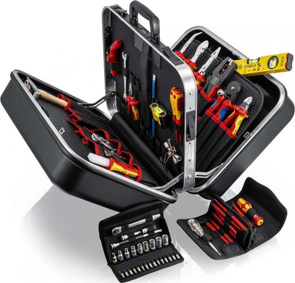00 21 42 Werkzeugkoffer BIG Twin Elektro Bestückt mit 14 KNIPEX-Werkzeugen, insgesamt 63 Markenwerkzeugen, teilweise VDE-geprüft nach DIN EN 60900. Insgesamt 95 Steckmöglichkeiten. Max. Zuladung: 25 kg. 38 Liter Fassungsvermögen. Frei stehend in allen Öffnungslagen durch beidseitig angebrachte, rastende Deckelhalter mit Scharniermechanik, Winkel frei einstellbar. Ein- oder beidseitig zu öffnen. Boden und Deckel lassen sich unabhängig voneinander öffnen. Beschriftungsfeld mit zwei Aufklebern zur individuellen Kennzeichnung. Strapazierfähige Ausführung aus ABS-Material, schwarz. Umlaufender Aluminiumrahmen mit fest montierter, stabiler, beidseitig bestückbarer Mittelwand, mit vielseitigen Einsteckmöglichkeiten durch elastische Schlaufen und zwölf kleinen Taschen. Metallscharniere. Dreistelliges Zahlenschloss zum sicheren Verschließen des Koffers. Je zwei Metall-Kippschlösser zur Fixierung des Deckels und des Bodens. Herausnehmbares Dokumentenfach und herausnehmbare Werkzeugtafel aus schmutzabweisenden PP-Hohlkammerplatten mit 13 Werkzeugtaschen. Bodenschale, per Druckknopf fixierbar, Höhe 58 mm, durch flexible Einsätze unterteilbar und Abdecktafel mit sechs großen Werkzeugtaschen. - Abmessung Breite außen (innen): 520mm 490mm - Abmessung Höhe außen (innen): 435mm 370mm - Abmessung Tiefe außen (innen): 290mm 110mm Lieferumfang: 1 x 00 11 01 Knipex TwinKey Schaltschrankschlüssel der Standard Schaltschrankschlüssel (92 mm), 1 x 86 03 180 KNIPEX Zangenschlüssel Zange und Schraubenschlüssel in einem Werkzeug (180 mm), 1 x 98 52 KNIPEX Kabelmesser (190 mm), 1 x 97 53 04 KNIPEX Selbsteinstellende Crimpzange für Aderendhülsen mit Seiteneinführung (0,08 10 + 16 mm²), 1 x 08 26 145 KNIPEX Spitz-Kombizange (145 mm), 1 x 87 01 180 Knipex Cobra Hightech-Wasserpumpenzange (180 mm), 1 x 98 25 01 SL KNIPEX Schraubendreher (Slim) für Kreuzschlitzschrauben Pozidriv (PZ1 x 80 mm), 1 x 98 20 35 SL KNIPEX Schraubendreher (Slim) für Schlitzschrauben (0,6 x 3,5 x 100 mm), 1 x 13 86 200 KNIPEX Elektro-Installationszange (Ø 15 mm / 50 mm²), 1 x 16 95 01 SB KNIPEX ErgoStrip Universal-Abmantelungswerkzeug für Rechtshänder (Ø 8,0 13,0 mm), 1 x 70 06 160 Knipex Seitenschneider (160 mm), 1 x 26 26 200 Knipex Flachrundzange mit Schneide (Storchschnabelzange) (200 mm), 1 x 5003484001 Wera VDE Wechselklingensatz, 16-teilig, Slim, 1 x 004018 Wera Zyklop Metal-Knarrensatz 8100 SA 8 28-teilig (1/4), 1 x 003760 Wera Joker Doppelmaulschlüssel (10 x 13 mm), 1 x 101-0300 Picard Schlosserhammer (300 g), 1 x 9R 212 00096 Rennsteig , 1 x 361 252 1 Rennsteig Elektrikermeißel (250 x 10 mm), 1 x 16135 Stabila Wasserwaage Typ 70 Electric (430 mm), 1 x 18115 Stabila Mini-Wasserwaage Pocket Electric (68 mm), 1 x 12 52 195 SB KNIPEX PreciStrip16 Automatische Abisolierzange (0,08 - 16 mm²), 1 x 74 06 200 Knipex Kraft-Seitenschneider (200 mm),.