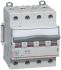 Legrand Lasttrennschalter DX3, 4-polig, 100A 400 VAC, nach EN 60947-3, EN 60669-2-4. Gebrauchskategorie AC-22A. Befestigung auf Hutprofilschiene EN 60715 durch rastende Schnellbefestigungen, klare Information vorne auf jedem Gerät, eindeutige Schaltstellungsanzeige rot/grün am Schalthebel (verriegelbar), mit Beschriftungsfenster, einpolig verschienbar mit Legrand Stiftkammschienen, Anbau von Hilfsgeräten möglich.