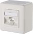 Aufputz-Anschlusseinheit 85 x 85 x 43 mm für alle Einzelmodule in Modulbauform (Achtung: E-DAT modul Kupplungen 8(8) nur mit geeignetem Patchkabel), Steckrichtung des Moduls 45° nach unten geneigt, Zugentlastung am Modul, mit Sichtfenster für beiliegende Beschriftungseinlage, Beschriftungsbogen 209 x 294 mm siehe Zubehör, integrierte Staubschutzklappen (auch farbig erhältlich), Abdeckteile reinweiß RAL 9010, Oberfläche matt strukturiert, Varianten: 1 Port, 2 Port, 3 Port