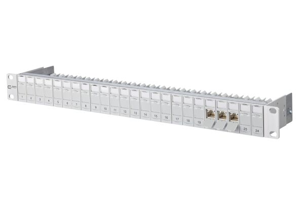 19 Zoll 1HE Modulträger mit 24 Einzelmodulen C6, Amodul 180°GHMT Cat.6, A re-embedded PVP zertifiziertCat.6, A Komponentenprüfung nach ISO/IEC 11801, DIN EN 50173-1, ANSI/TIA-568.2-D und IEC 60603-7-51, GHMT zertifiziertEinhaltung der Klasse E, A bis 500 MHz nach ISO/IEC 11801, DIN EN 50173-1getestet: Komponente bis 600 MHz, Link bis 800 MHz, für 10GBit Ethernet (IEEE 802.3an), Remote Powering (PoE, PoE plus, UPoE und 4PPoE) und HDBaseT geeignet, Anschluss von Datenleitungen AWG 26/1 - 22/1 (eindrähtig) und AWG 26/7 bis 22/7 (mehrdrähtig) an IDC-Schneidklemmen, Spezialwerkzeug-freie Migration auf 25G-Systeme, Modulträgerfront aus silber eloxiertem Aluminium, Modulhalter aus Kunststoff mit Staubschutzklappen (weitere Farben als Zubehör erhältlich) nach vorne entnehmbar, integrierte Kabelabfangung, zusätzliche Zugentlastung möglich, Sichtfenster für beiliegende Beschriftungseinlage, Beschriftungsbogen 210 x 297 mm siehe Zubehör, Erdungsbolzen M6 x 10 mit Mutter und Zahnscheibe, inkl. 30 cm Erdungskabel, alle vollgeschirmten Module mittels Erdungsschiene verbunden