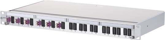 19 Zoll, 1HE LWL-Patchfeld mit ausziehbarer Spleißablage/Frontblende (grau oder schwarz), bestückt mit LC-D-Kupplungen und LC-Pigtails, Pigtails mit Kompaktader ø 0,9 mm, 12 Farben, Sekundär- und Primärcoating gleichgefärbt, Länge 2,0 m, Pigtails in Standardspleißkassette mit Crimpspleißhaltern eingelegt und abgesetzt, Pigtails gereinigt und in Kupplungen eingesteckt, Auszug zur besseren Montage abkipp- und komplett herausnehmbar (Auszugsstopp), leichte Aluminium-Konstruktion, nicht belegte Ausbrüche mit Blindstopfen verschlossen, variable Kabeleinführung (gerade/schräg) beidseitig möglich, Kabelabfangung mittels mitgeliefertem Kabelbinder oder optionaler Kabelverschraubung möglich, Kabeldurchmesser 3 bis 20 mm, Zugentlastung für Zentralelement/Aramid, Kabelmanagement durch frei positionierbare Führungselemente, schraubenlose Abdeckung, Sichtfenster für beiliegende Beschriftungseinlagen, Varianten: bestückt mit 6, 12 oder 24 LC-D Kupplungen und Pigtails jeweils blau (OS2), lindgrün (OM5), violett (OM4), aqua (OM3) oder 6, 12 oder 24 LC-D APC Kupplungen und Pigtails jeweils grün (OS2)