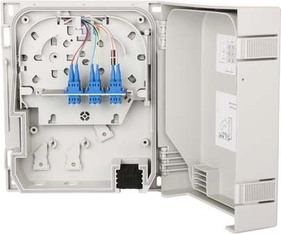 Glasfaser Spleiß-/Verteilgehäuse zum Einsatz als Hausübergabepunkt , bestückt mit LC-D Kupplungen und LC-Pigtails, Deckelverriegelung mittels Rasthaken mit Möglichkeit zur Plombierung., Deckel kann zur Erleichterung der Montage sehr einfach demontiert werden, Spleißkassette zur einfachen Montage und Wartung bei größtmöglichem Schutz der Fasern mit Auskreuzungsmöglichkeit und Faserüberlängenablage, mit oder ohne Schloss erhältlich, Zugentlastung für Kabel und Patchkabel, Montagemöglichkeit und Fixierung für Gas-/Wasserblocker vorhanden, Patchkabelausgang mit flexibler Lamellendichtung, zwei Kabeleinführungen für M20/25, eine M20-Verschraubung beiliegend, Befestigungsmöglichkeit für optische Koppler, strukturiertes ASA (Acrylester-Styrol-Acrylnitril) in RAL 7035, extrem widerstandsfähiger Kunststoff, schlagzäh und witterungsbeständig, Schutzklasse nach IEC 60529: IP 54 , Varianten: bestückt mit bis zu 6 LC-D Kupplungen und bis zu 12 LC-Pigtails, jeweils blau (OS2) oder LC-D APC, jeweils grün (OS2)