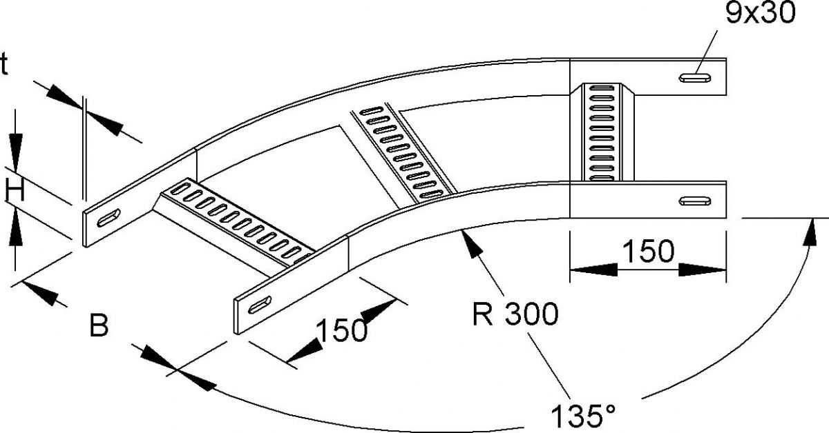 Bogen 45°, mit ungelochten Seitenholmen, mit Verbindungslochung für den Anschluss und eingeschweißten, trapezförmigen perforierten Sprossen, für Marinekabelleitern, zur Herstellung von 45° horizontal abgewinkelten Marinekabelleiterverlauf. Befestigungszubehör für den Anschluss bitte gesondert bestellen. Verwendung für : Marinekabelleiter/Steigetrasse KLMUL 40... Abmessungen (ca. Maße) H x B (innen) : 40 x 1000 mm Materialstärke t : 5 mm Innenradius R : 300 mm Werkstoff : Stahl, tauchfeuerverzinkt nach DIN EN ISO 1461
