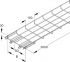 Gitterrinne nach DIN EN 61537, U-förmig, aus Stahldrähten, punktgeschweißt, zur Schnellbefestigung mit angeschweißten Stoßstellenverbindern in den Seiten und im Boden. VDE zertifiziert! Abmessungen (ca. Maße) Nennmaße H x B (innen) : 30 x 300 mm Längsdraht-Ø : 3,9 mm Bodenlängsdrahtabstand : 50 mm Querdraht-Ø : 3,9 mm Querdrahtabstand : 100 mm Lieferlänge L : 3000 mm Nutzbarer Querschnitt : 8054 mm² Werkstoff : Stahl, galvanisch verzinkt nach DIN EN ISO 19598, blaupassiviert