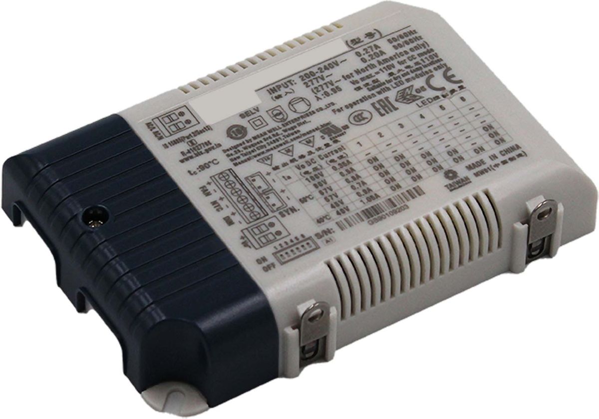 Dimmbares LED Betriebsgerät mit einstellbarem Konstantstrom über DIP-Schalter. Einstellbare Konstantströme: 350mA, 500mA, 600mA, 700mA, 900mA, 1050mA. Anschlussart primär: abgedeckte Klemmstellen 0,5-2,5 mm². Anschlussart sekundär: abgedeckte Klemmstellen 0,5-1,5 mm².