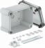 Kabelabzweigkasten mit Hutprofilschiene zum Verbinden von Kabeln und Leitungen im Innen- und Außenbereich. Rechteckige Form ohne Einführungen. Geeignet für die Wand-/ Deckenmontage mit der Möglichkeit zur Außenbefestigung, Innenbefestigung oder Montage über die Eckdome. Besonders schlagfest mit IK09. Transparenter Deckel mit Schnellverschluss, plombierbar. Hergestellt aus halogenfreien und UV-resistenten Materialien. Inklusive Hutprofilschiene Typ 2069 und Befestigungsset. Kabelabzweigkasten gemäß DIN EN 60670. Schlagfestigkeit IK09 gemäß DIN EN 50102. Schutzart IP67 gemäß DIN EN 60529.
