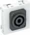 Multimediaträger mit einer Speakon-Anschlussbuchse, Kabelauslass gerade, ohne Beschriftungsfeld, Speakon-Buchse 4-polig mit Schraubanschluss. Trägerplatte mit Rastbefestigung, geeignet für den waagerechten und senkrechten Einbau in die Systemumgebung.