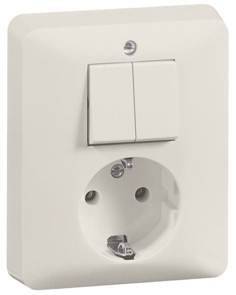 Kombination mit voller Abdeckplatte für Einzelmontage, bestehend aus: Wippschalter 10 A 250 V~, Steckdose SCHUKO 2-polig, 16 A 250 V, für 58er Einbaudosen Serienschalter (nur für Export bestimmt)