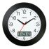 Innenuhr, rund, schwarzes Kunststoffgehäuse, gewölbtes Kunststoffglas. Großes LCD-Display zeigt abgekürzten Wochentag (deutsche Schreibweise) und Datum. Batteriebetrieb 1,5 V.