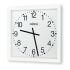 Innenuhr, quadratisch, einseitig, sehr stabiles, weiß lackiertes Metallgehäuse (RAL 9016) für hohe Beanspruchungen, stoßgeschütztes Kunststoffglas (Acrylglas®XT). Weißes Metallzifferblatt mit schwarzen arabischen Zahlen, Zifferblattdruck nach DIN 41091. Schwarze Balkenzeiger für Stunden- und Minutenanzeige. Betriebsspannung 230 V.
