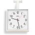 Innenuhr, quadratisch, sehr stabiles, weiß lackiertes Metallgehäuse (RAL 9016) für hohe Beanspruchungen, mit stoßgeschützten Plexigläsern. Weiße Zifferblätter mit schwarzen arabischen Zahlen, Zifferblattdruck nach DIN 41091. Schwarze Balkenzeiger für Stunden- und Minutenanzeige, bzw. rot für Sekundenanzeige. Betriebsspannung über PoE (Power over Ethernet), entsprechende Hardware ist bauseits zu stellen.