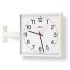 Innenuhr, quadratisch, sehr stabiles, weiß lackiertes Metallgehäuse (RAL 9016) für hohe Beanspruchungen, mit stoßgeschützten Plexigläsern. Weiße Zifferblätter mit schwarzen arabischen Zahlen, Zifferblattdruck nach DIN 41091. Schwarze Balkenzeiger für Stunden- und Minutenanzeige, bzw. rot für Sekundenanzeige. Betriebsspannung über PoE (Power over Ethernet), entsprechende Hardware ist bauseits zu stellen.