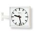 Innenuhr, quadratisch, sehr stabiles, weiß lackiertes Metallgehäuse (RAL 9016) für hohe Beanspruchungen, mit stoßgeschützten Plexigläsern. Weiße Zifferblätter mit schwarzen DIN-Balkenziffern, Zifferblattdruck nach DIN 41091. Schwarze DIN-Balkenzeiger für Stunden- und Minutenanzeige, bzw. rot für Sekundenanzeige. Betriebsspannung über PoE (Power over Ethernet), entsprechende Hardware ist bauseits zu stellen.
