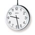 Innenuhr, rund, doppelseitig, Metallgehäuse weiß lackiert (RAL 9016), Deckenhalterung in Metalliclackierung Eisenglimmer (DB 703), gewölbte stoßgeschützte Plexigläser. Weiße Metallzifferblätter mit schwarzen arabischen Zahlen, Zifferblattdruck nach DIN 41091. Schwarze Balkenzeiger für Stunden- und Minutenanzeige. Betriebsspannung über PoE (Power over Ethernet), entsprechende Hardware ist bauseits zu stellen.